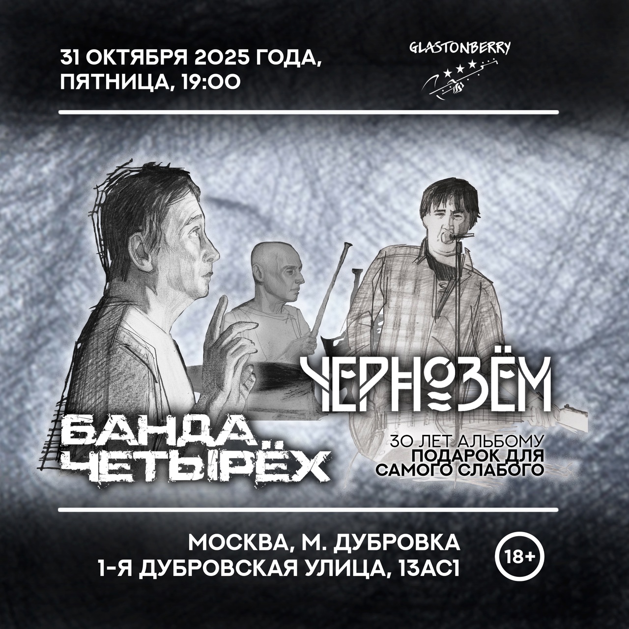 Группа Чернозём презентует цифровой релиз альбома “Подарок для самого слабого”, вышедшего 30 лет назад. Банда Четырёх покажет новые песни.